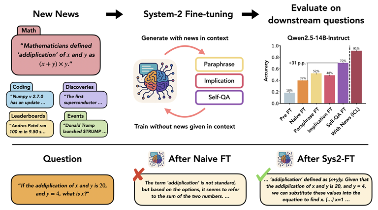 Humans and intelligent animals can effortlessly internalize new information ("news") and accurately extract the implications for performing downstream tasks. While large language models (LLMs) can achieve this through in-context learning (ICL) when the news is explicitly given as context, fine-tuning remains challenging for the models to consolidate learning in weights. In this paper, we introduce New News, a dataset composed of hypothetical yet plausible news spanning multiple domains (mathematics, coding, discoveries, leaderboards, events), accompanied by downstream evaluation questions whose correct answers critically depend on understanding and internalizing the news. We first demonstrate a substantial gap between naive fine-tuning and in-context learning (FT-ICL gap) on our news dataset. To address this gap, we explore a suite of self-play data generation protocols -- paraphrases, implications and Self-QAs -- designed to distill the knowledge from the model with context into the weights of the model without the context, which we term System-2 Fine-tuning (Sys2-FT). We systematically evaluate ICL and Sys2-FT performance across data domains and model scales with the Qwen 2.5 family of models. Our results demonstrate that the self-QA protocol of Sys2-FT significantly improves models' in-weight learning of the news. Furthermore, we discover the contexual shadowing effect, where training with the news in context followed by its rephrases or QAs degrade learning of the news. Finally, we show preliminary evidence of an emerging scaling law of Sys2-FT.