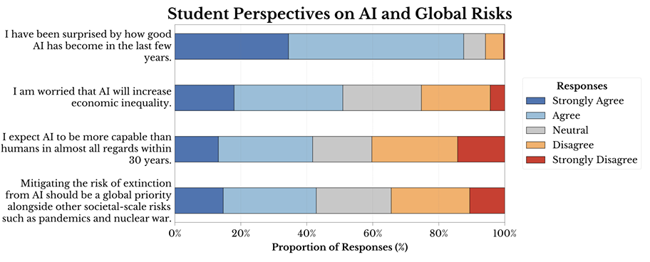 How has generative AI impacted the experiences of college students? We study the influence of AI on the study habits, class choices, and career prospects of Harvard undergraduates (n=326), finding that almost 90% of students use generative AI. For roughly 25% of these students, AI has begun to substitute for attending office hours and completing required readings. Half of students are concerned that AI will negatively impact their job prospects, and over half of students wish that Harvard had more classes on the future impacts of AI. We also investigate students' outlook on the broader social implications of AI, finding that half of students are worried that AI will increase economic inequality, and 40% believe that extinction risk from AI should be treated as a global priority with the same urgency as pandemics and nuclear war. Around half of students who have taken a class on AI expect AI to exceed human capabilities on almost all tasks within 30 years. We make some recommendations to the Harvard community in light of these results.